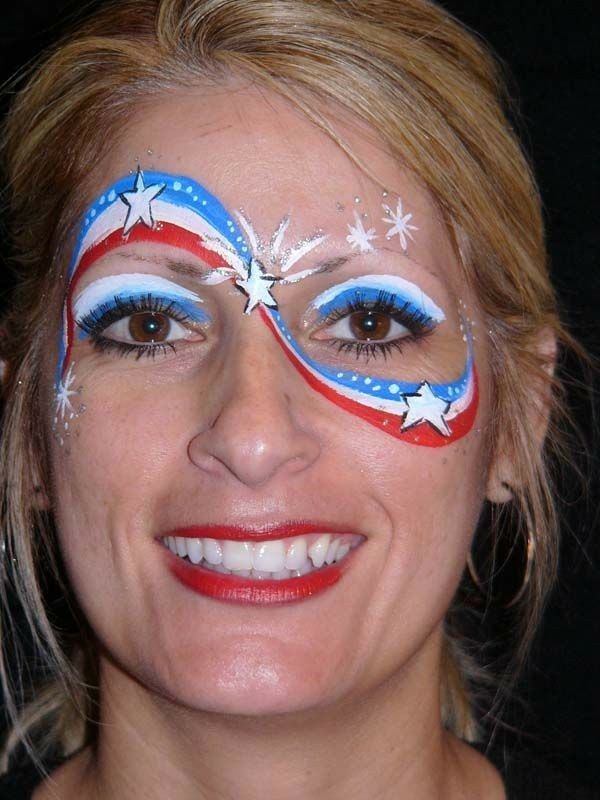 This playful 4th july face make-up uses swirling blue and red lines paired with light blue stars for a whimsical, feminine look. It is a popular 4th july face paint choice for community events because it is fast to apply and highly visible from a distance. If you need 4th july facepaint ideas that incorporate fun accessories like themed eyelashes, this swirled design provides the perfect backdrop.