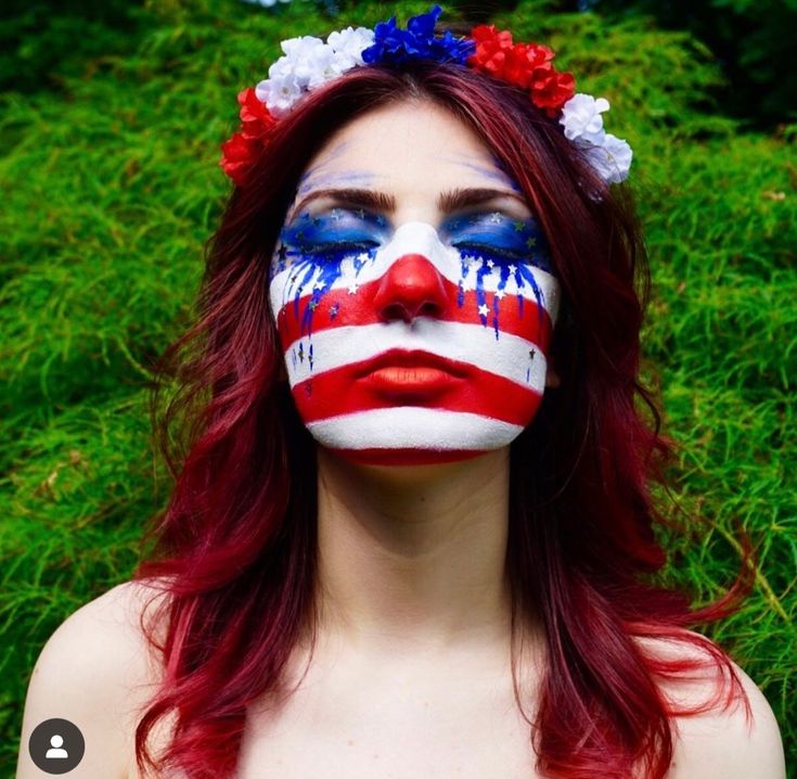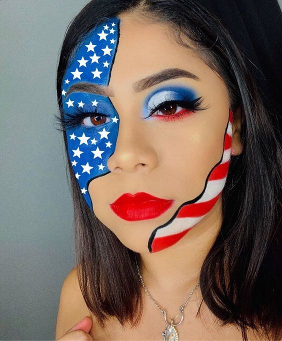 This immersive 4th july face paint style covers the entire face with a flowing flag design and dramatic blue eyeshadow. It is one of the most artistic 4th july facepaint ideas, using the contours of the nose and forehead to create a sense of movement in the stripes. While more time-consuming than a 4th july face paint easy cheek design, the final result is a stunning piece of holiday performance art.