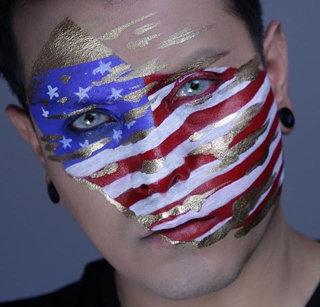 This edgy 4th july face make-up utilizes metallic gold strokes to frame a weathered version of the stars and stripes across the eyes. It is a unique departure from standard 4th july facepaint ideas, offering a “street art” aesthetic that feels modern and bold. Even though it looks intricate, the “brushed-on” style makes it a surprisingly 4th july face paint easy look to replicate with a flat brush.