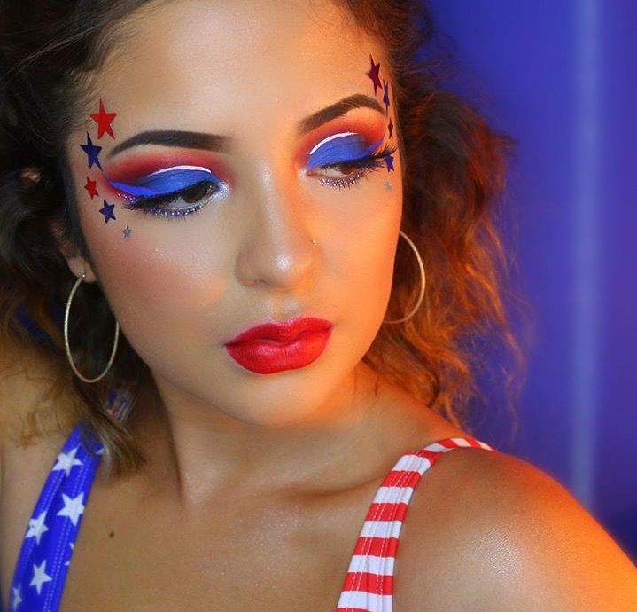 This look elevates 4th july face make-up by combining precision winged eyeliner with delicate star decals around the temples. It serves as a more sophisticated 4th july face paint alternative for adults attending a holiday event or dinner. By focusing on the eyes and brow bone, these 4th july facepaint ideas offer a chic and polished way to show off your patriotic spirit.