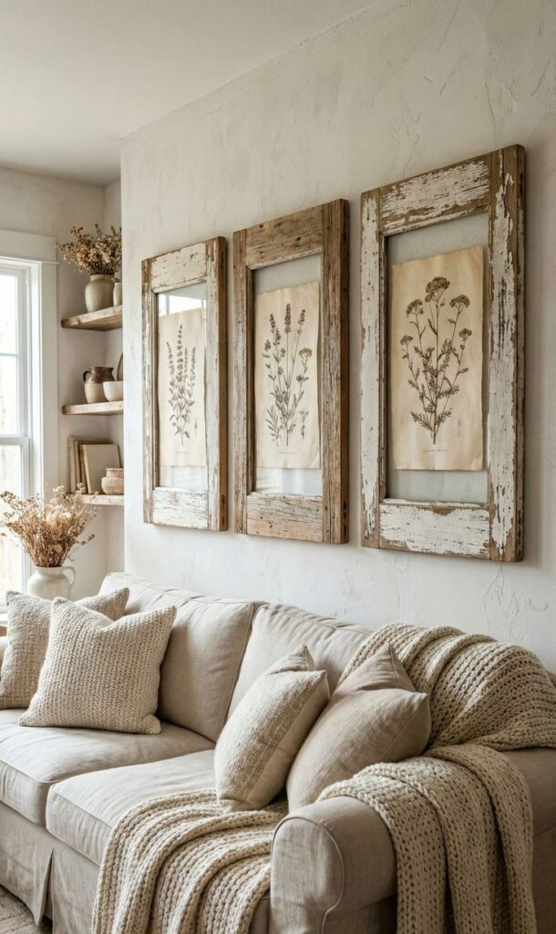 Three distressed wood-framed botanical prints hung side-by-side against a creamy wall bring such soft, timeless farmhouse charm that pairs beautifully with chunky knits and neutral textures! It’s an easy win—print vintage herb illustrations, pop them in matching (but slightly worn) frames, and hang them low enough to enjoy from the couch for that collected-over-time feel.