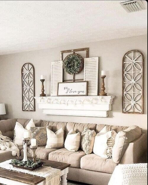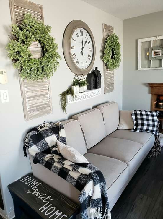Vintage shutters, a lush wreath, and a big round clock create the most charming, farmhouse-inspired wall that screams cozy! Thrift some shutters or buy faux ones, add a wreath and clock for balance, and layer in textures like a throw or pillows for extra warmth.