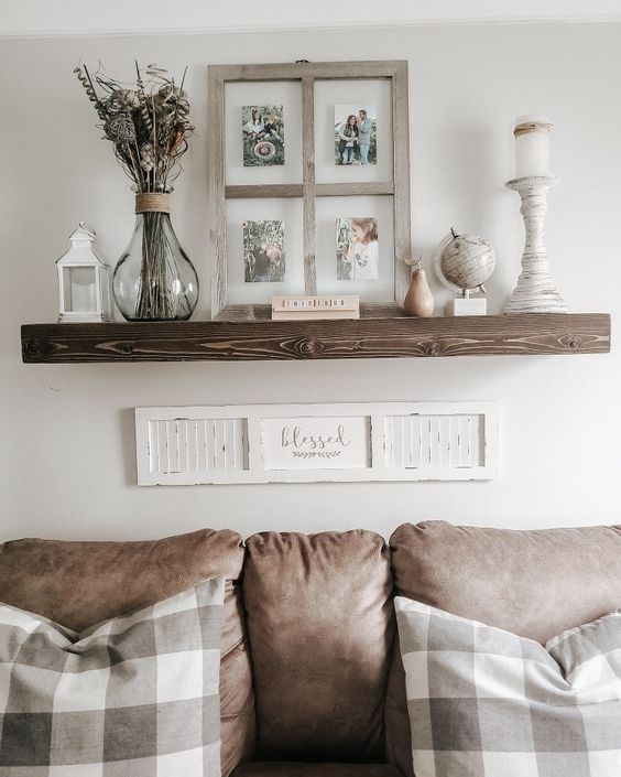 A chunky wood shelf styled with dried florals, family photos, a sweet “blessed” sign, and cozy candles feels warm, personal, and oh-so-inviting! Mix meaningful items with seasonal bits like greenery or candles—you can swap things out anytime to keep it fresh and totally yours.