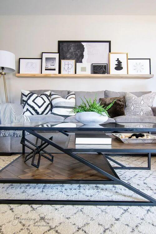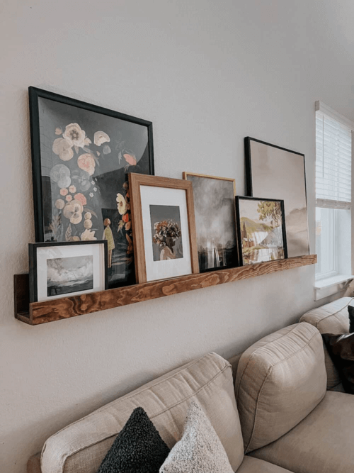 This layered mix of black-and-white art, abstract pieces, and simple frames on a floating wooden shelf creates such a polished, collected look that instantly draws the eye! You can totally recreate this—start with a few favorite prints, play with different frame styles, and let the shelf add that cozy, intentional touch.