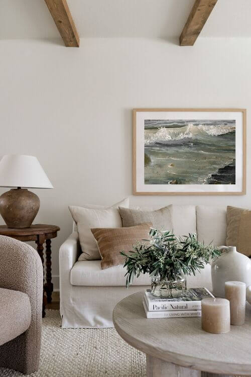 A single large ocean painting in a natural wood frame above the sofa, paired with textured neutrals and soft greenery, creates the most calming, breezy vibe! One big piece can be all you need—choose art that makes you happy, flank it with simple accents like candles or books, and let it shine.