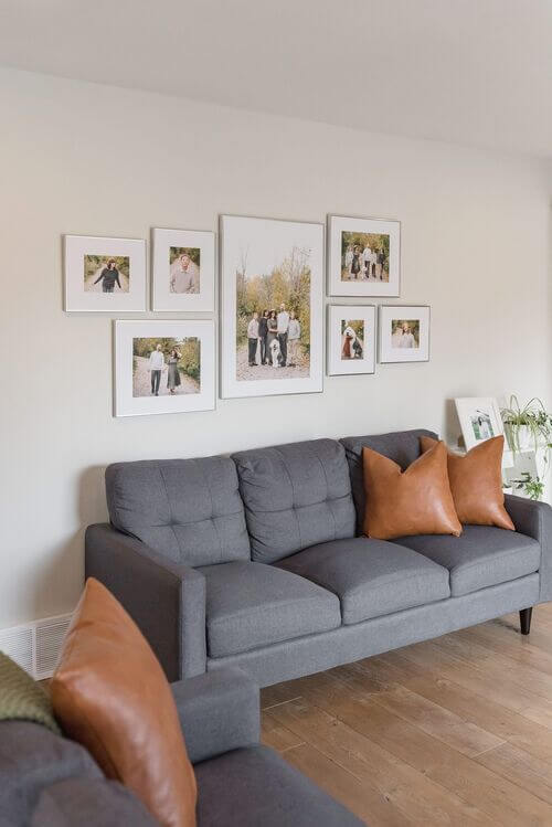 A simple black-frame gallery of adorable kid photos feels heartfelt, playful, and perfectly balanced above this soft sofa! Print in black and white or soft tones, arrange in a loose grid, and add a plant or lamp nearby—it’s the sweetest way to showcase your favorites.
