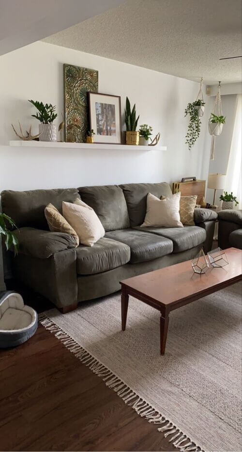 Floating shelves bursting with trailing ivy, pothos, and potted greenery turn the wall above the couch into a total indoor jungle—pure happiness! Start with a few sturdy shelves, mix real and faux plants for easy upkeep, and let those vines drape down for that dreamy, alive feel everyone loves.