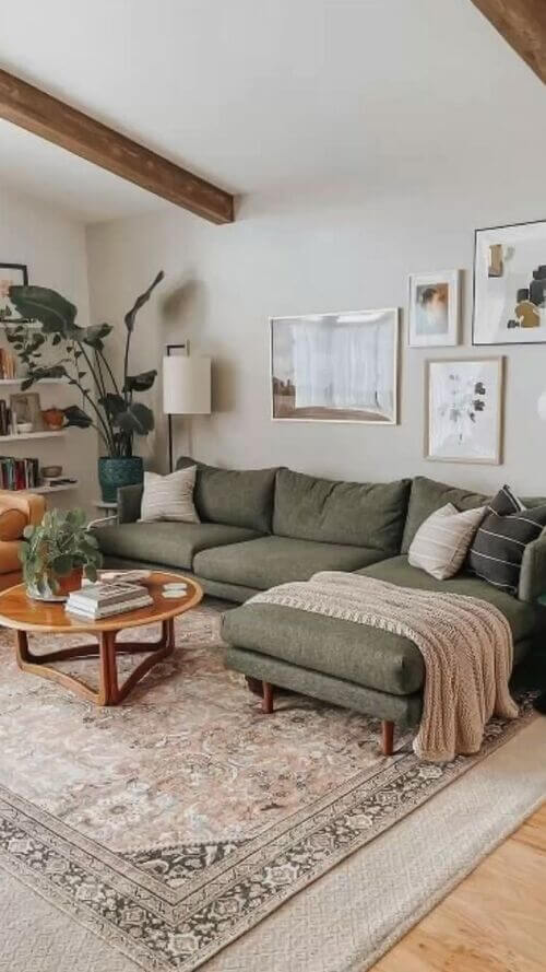 A mix of abstract art, botanicals, and large leafy plants above this gorgeous green sofa creates the most relaxed, nature-inspired vibe! Keep frames simple and neutral, let big plants steal the show, and you’ll have a living room that feels calm, collected, and totally inviting.