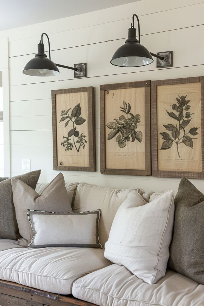 Three framed vintage botanical prints under sleek black sconces against shiplap bring such classic charm and subtle drama! Hang your art low enough to enjoy from the sofa, add wall lights for ambiance, and you’ve got a timeless look that’s easy to love year-round.
