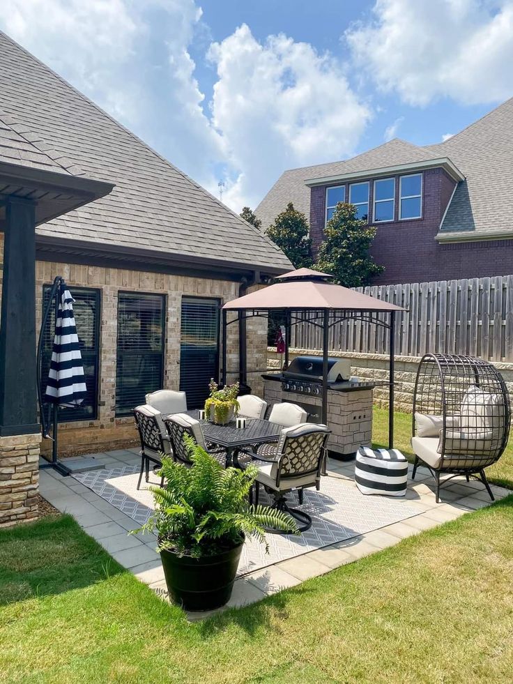 This patio is an excellent example of functional layering. By using rugs, lighting, and specialized furniture, it transforms a standard paved area into a multi-use living space that feels as intentional as an indoor dining room.
