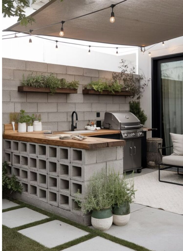This design is a masterclass in budget-friendly luxury. By pairing inexpensive industrial materials like cinder blocks with high-end finishes like wood and matte black fixtures, it creates a sophisticated, low-maintenance outdoor “room.”