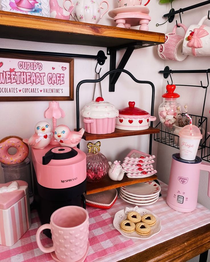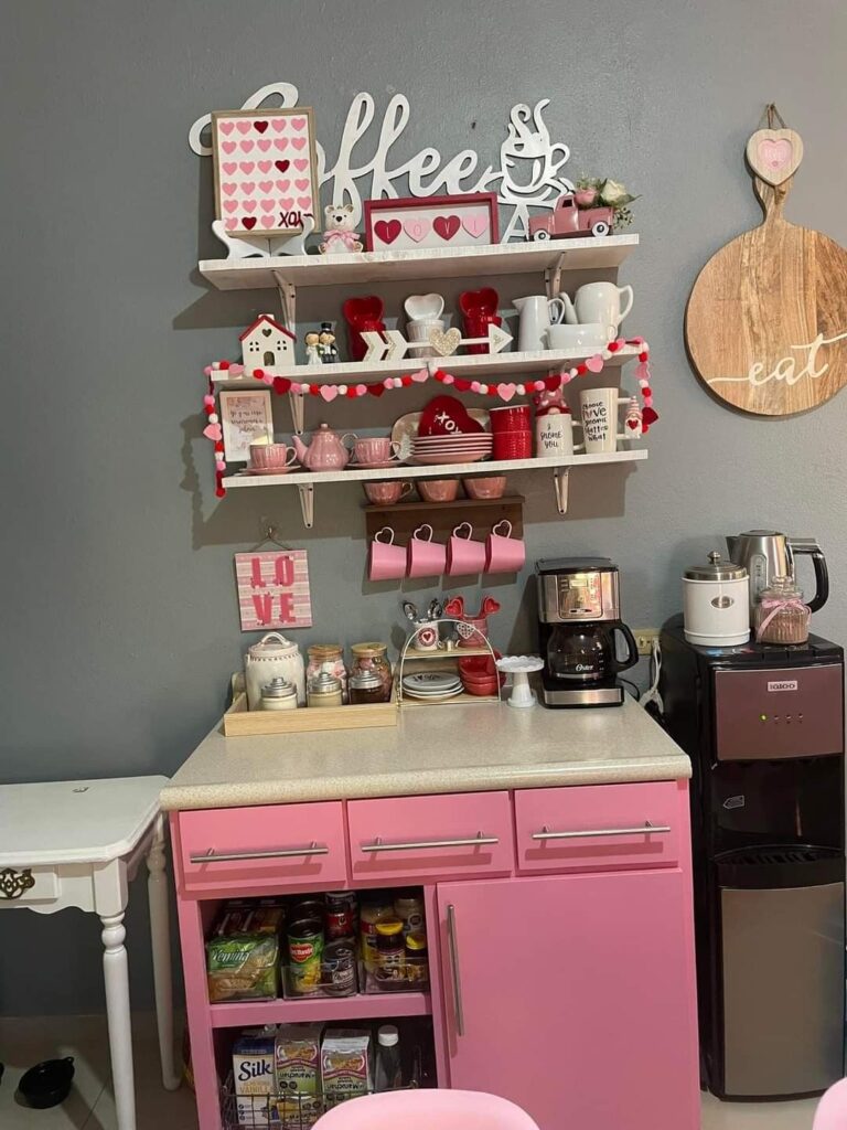 Create a warm and welcoming space by mixing bright pink cabinetry with festive heart garlands and “LOVE” signage. This setup proves that you can totally lean into a holiday theme while keeping your coffee and tea essentials perfectly organized.