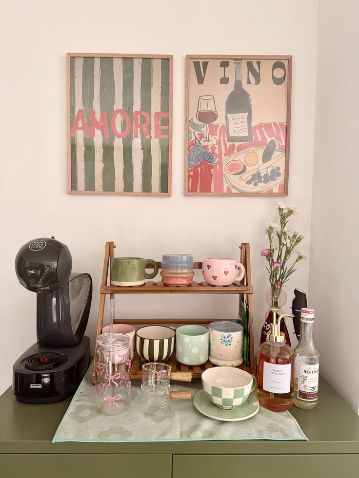 This cozy setup is giving major amore energy with those soft green stripes and playful vino artwork! Trust me, adding romantic prints and pastel mugs instantly turns your morning brew into a little European escape right in your apartment.