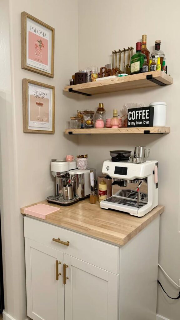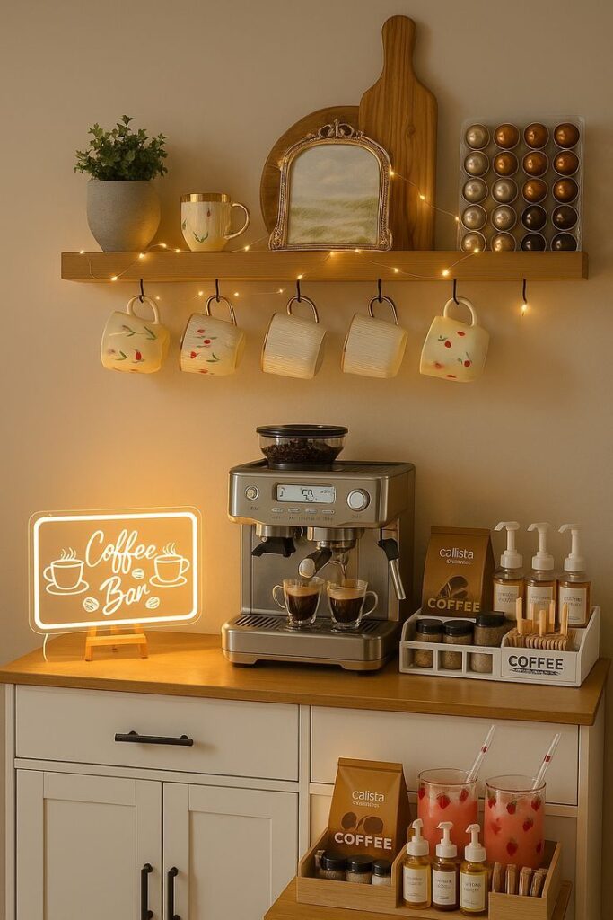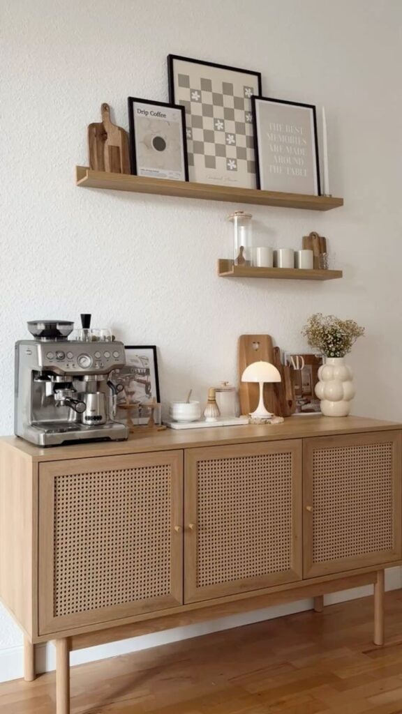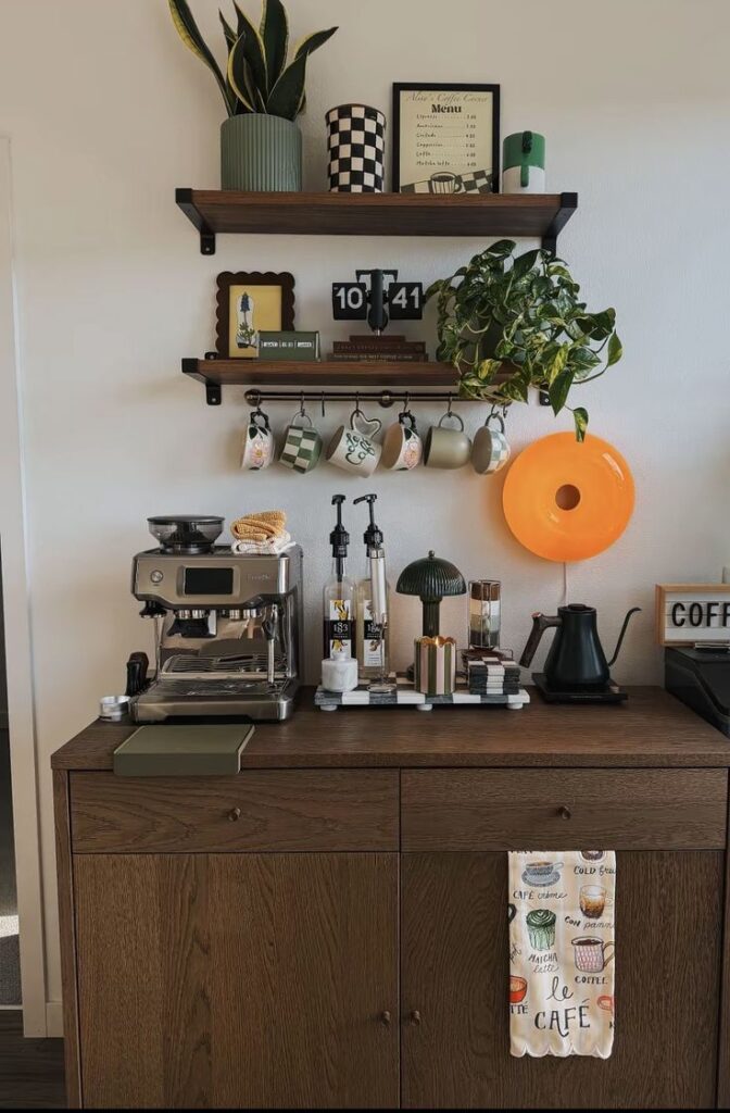 Love how this walnut cabinet with the cute menu sign and hanging mugs keeps everything tidy yet stylish! Style open shelves with syrups, a plant, and a framed pour-over shot—it’s effortless elegance for small apartments that still screams “coffee lover.