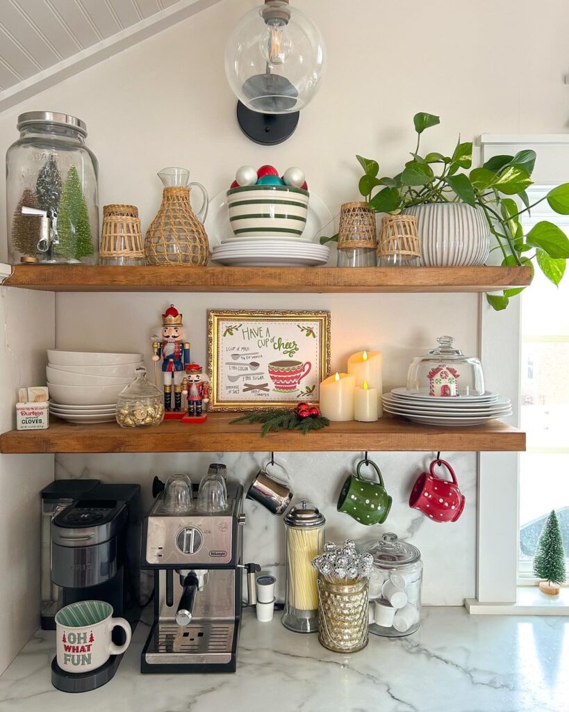 This festive holiday coffee and hot cocoa station is straight out of a winter dream—complete with nutcrackers, twinkling lights, and that adorable “Have a Cup of Cheer” recipe sign! The layered wooden shelves, hanging polka-dot mugs, and pops of red and green make it so cozy and inviting—perfect for turning your everyday brew into magical Christmas mornings in your small space.