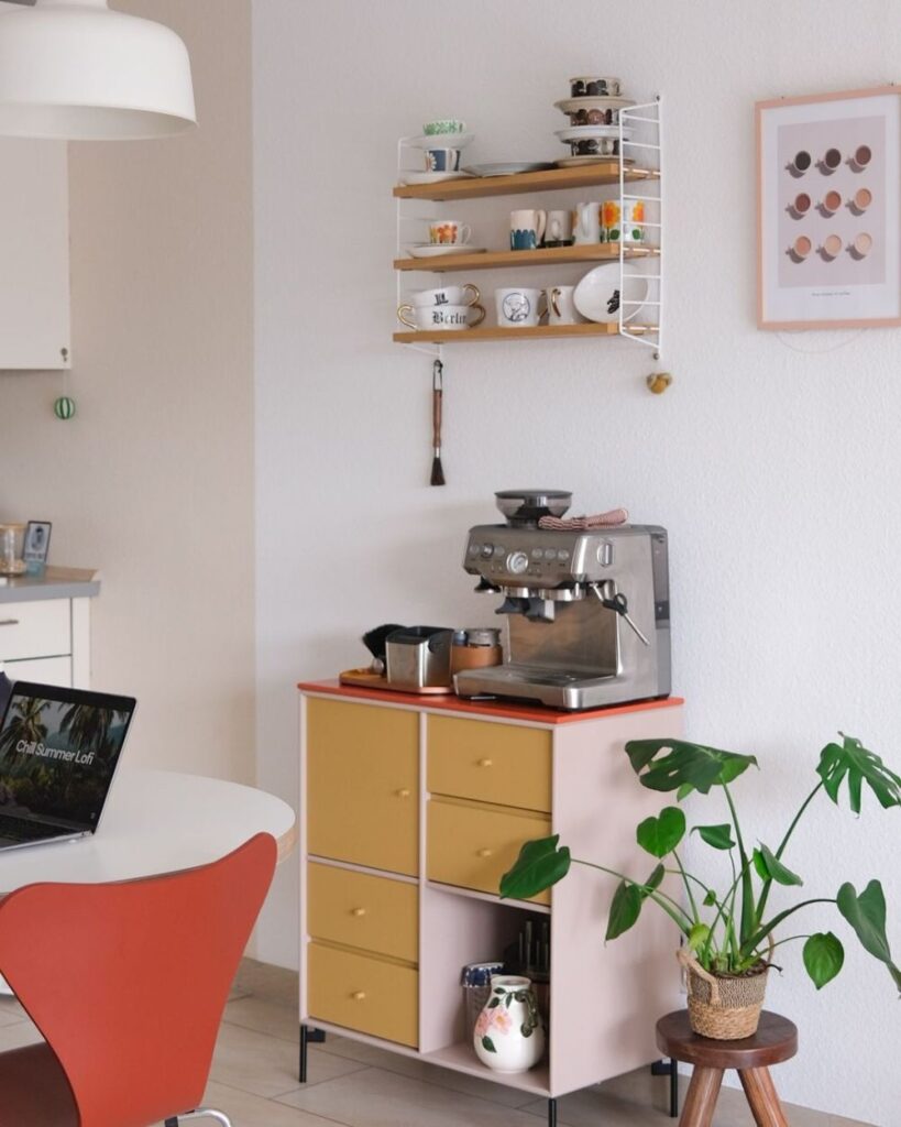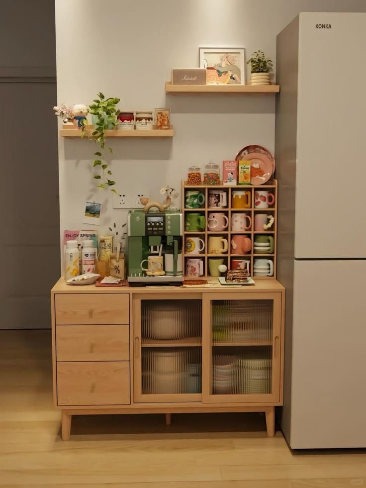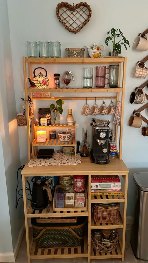 Look at this bamboo shelf loaded with personality—vintage tins, bright mugs, and that classic Smeg machine make it so inviting! Hang some fun coffee signs and add open baskets for easy access—it’s the ultimate way to turn a simple corner into your favorite daily spot.