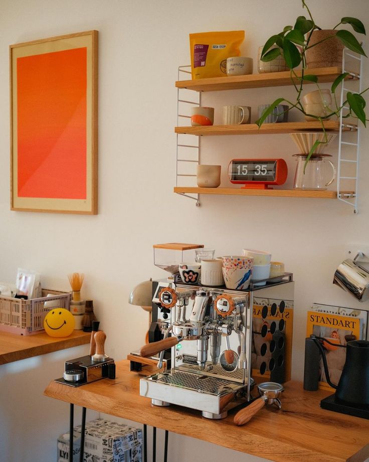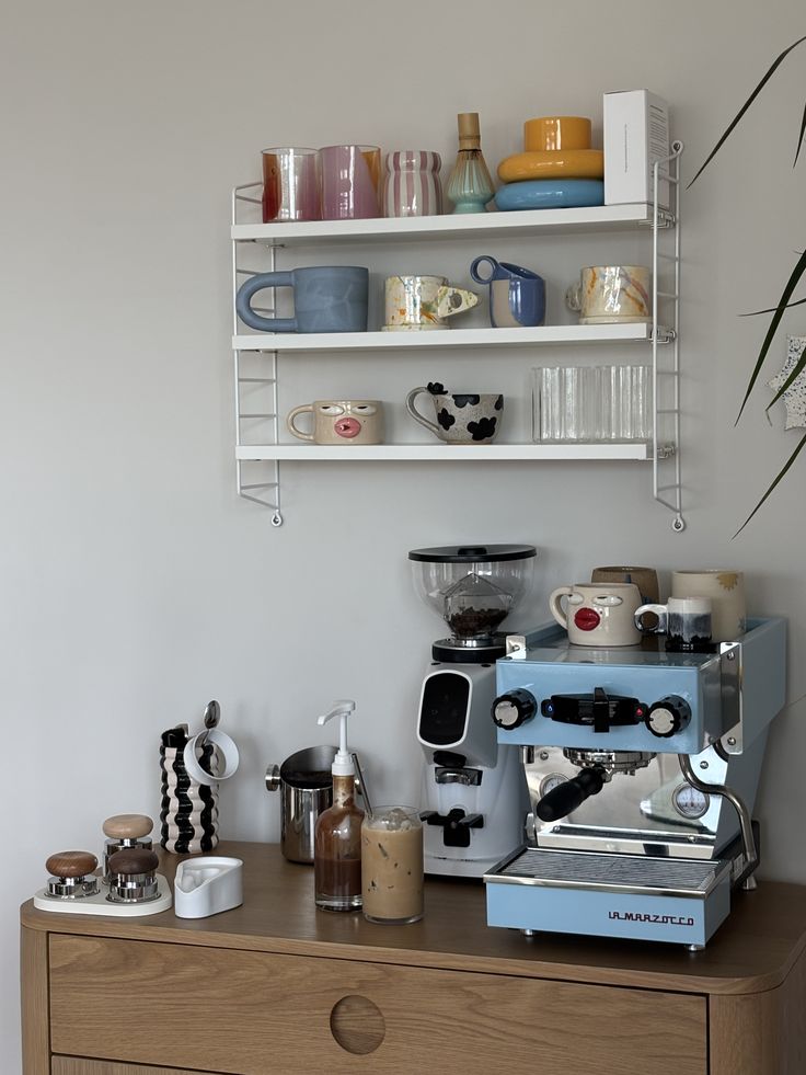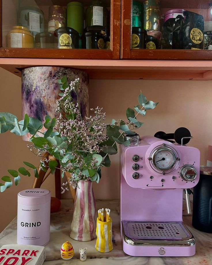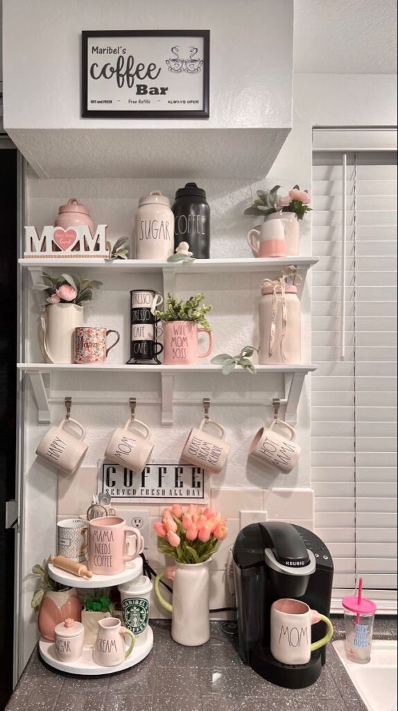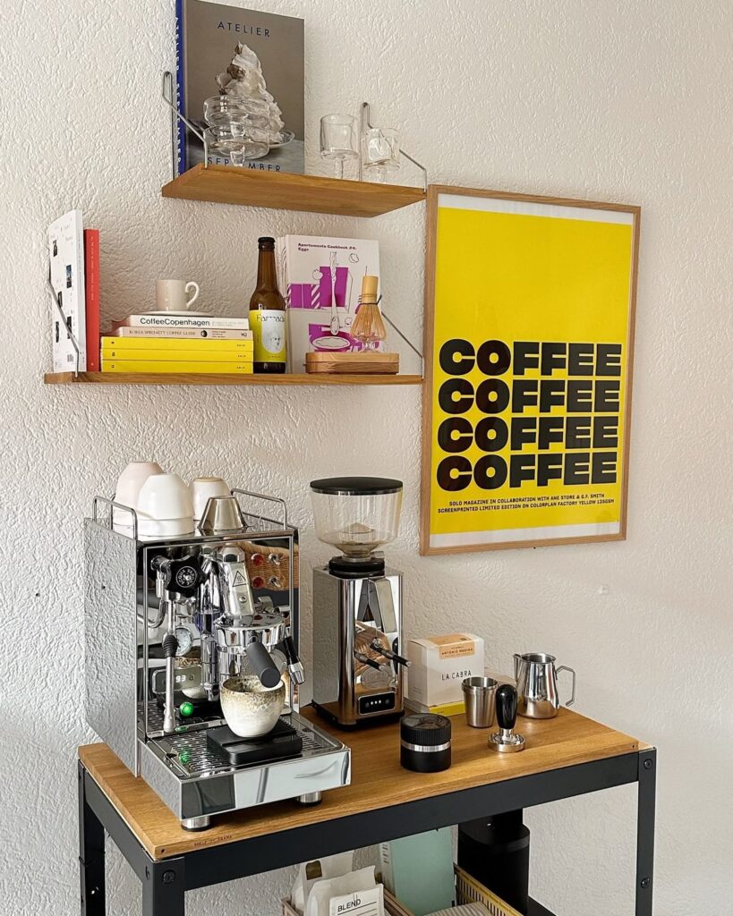 Pink everything? Yes please—this pastel espresso setup with fresh eucalyptus and marble touches is so dreamy and feminine! Add a pop of personality with colorful tins and tiny trinkets to make your coffee ritual feel like pure self-care bliss.