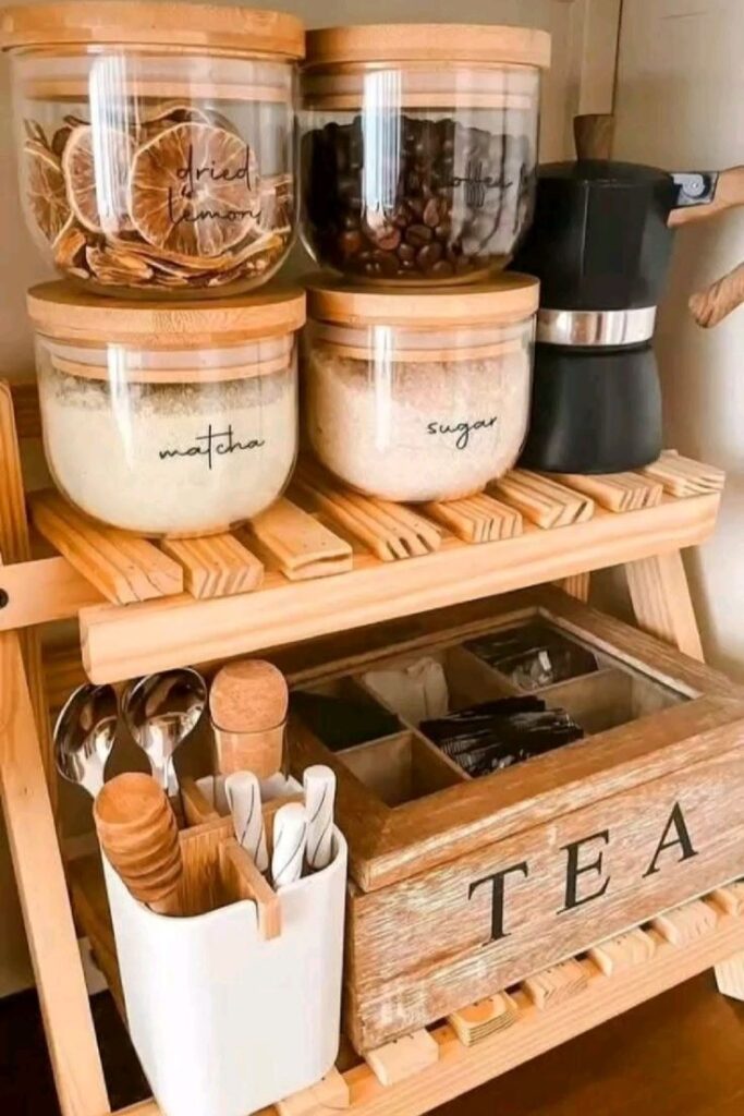 Never underestimate the power of clear glass jars with bamboo lids to elevate your pantry staples like matcha and sugar. Organizing your tea and coffee accessories in a rustic wooden drawer is a great trick to keep everything accessible but looking super aesthetic.