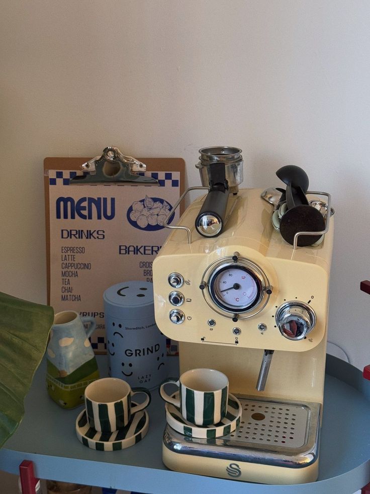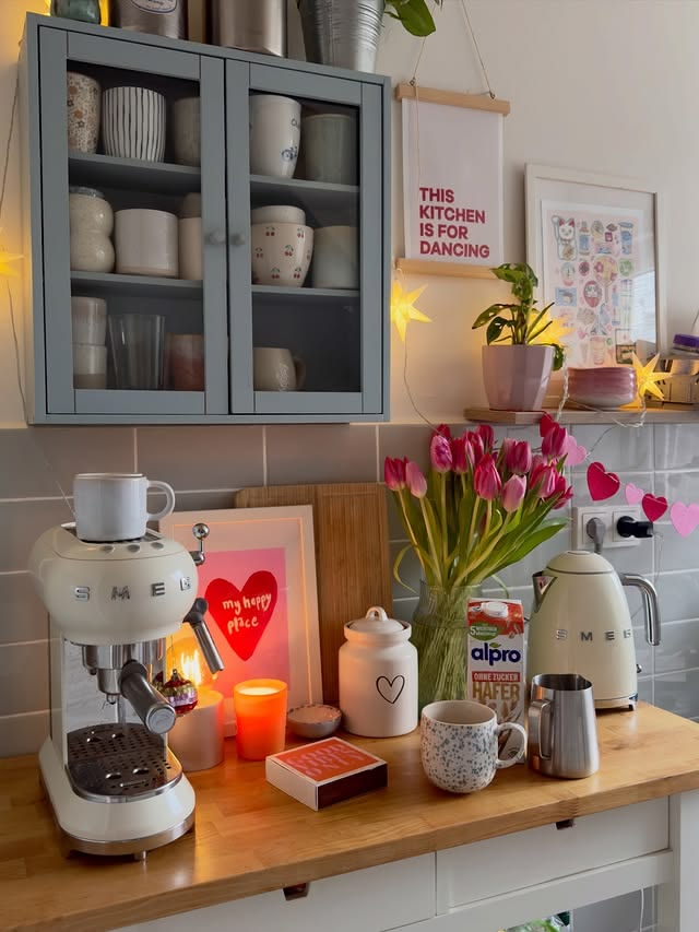 This creamy Smeg machine paired with striped cups and a handwritten menu is pure vintage charm! Keep things light and playful with smiley accessories and a clipboard drink list—your mornings will feel effortlessly cute and organized.