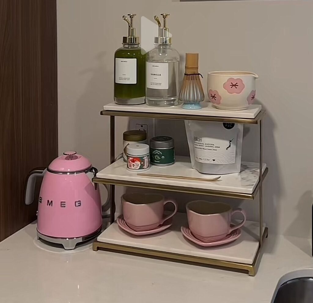 Combining marble and gold textures instantly gives any small apartment space a luxurious, high-end feel. This tiered stand is a total game-changer for organizing your daily essentials without the clutter.