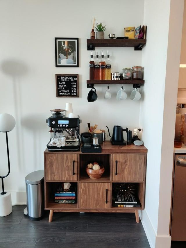 This sleek Breville setup with trailing greenery and those gorgeous fresh blooms is giving all the cozy morning magic! Add a simple metal shelf for extra storage and pops of color—your coffee routine will instantly feel like a little daily celebration in your tiny space.