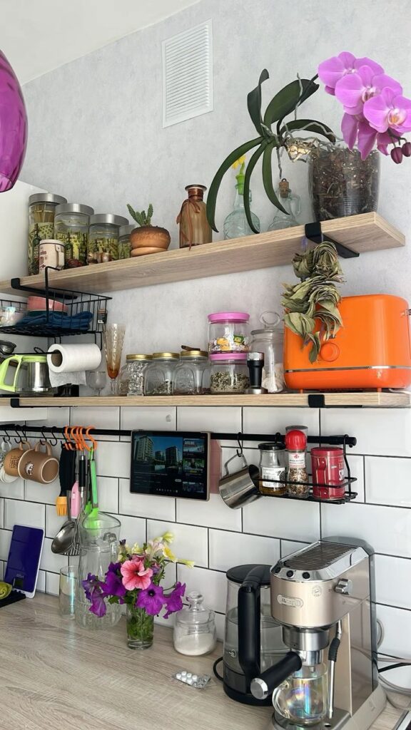 This wall of jars, dried herbs, vibrant orchids, and that pop of orange is pure organized chaos in the best way! Hang hooks for mugs and tools, toss in some greenery—it’s the perfect way to make your kitchen feel lived-in and inviting without any fuss.