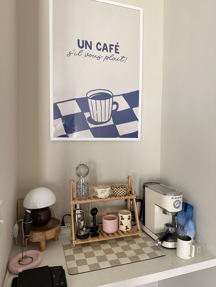 The “UN CAFÉ s’il vous plaît!” poster on that green checkered mat is adorable and gives instant Parisian café feels! Keep the accessories minimal with a cute mug stack and a tiny lamp—it’s the sweetest way to start your day with a smile.