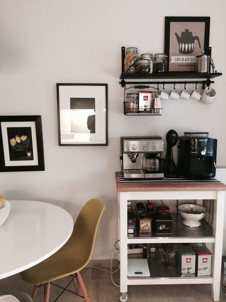 This clean white cart with black frames, Illy vibes, and hanging mugs is timeless and so easy to love! Add a few jars of beans and a cozy rug underneath—your mornings will feel polished and put-together even in the tiniest spot.