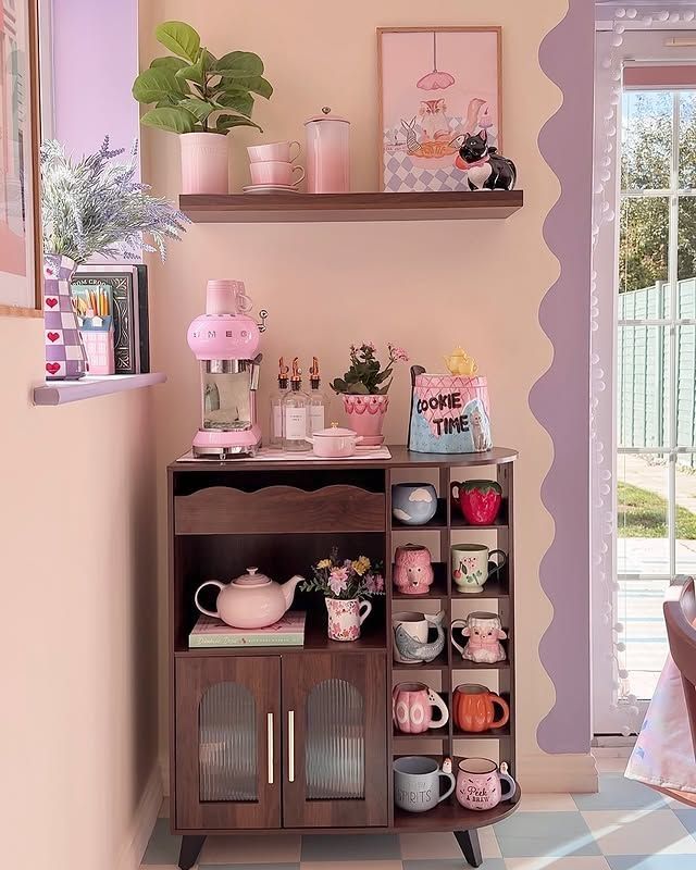 Mix playful wavy accents with sleek modern furniture to create a coffee station that feels like a total mood. Adding a pop of pink with your appliances is such a fun way to elevate a neutral corner!