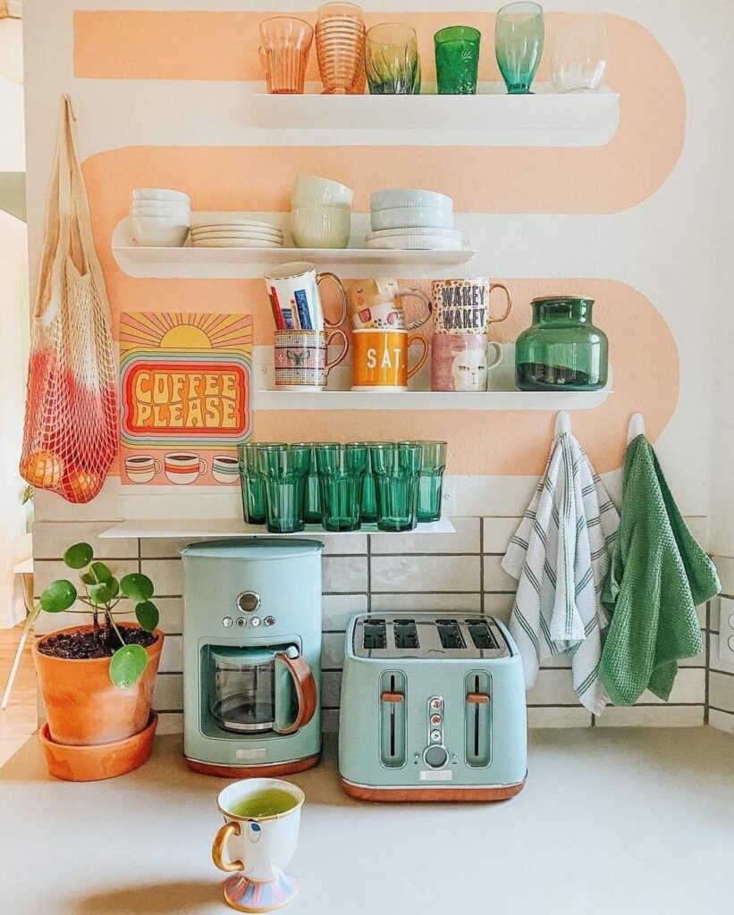 I love how this playful space uses a wavy peach wall mural to frame a retro-style mint coffee maker and toaster set. Mixing green glassware with “Wakey Wakey” mugs is such a fun, quirky way to make your morning routine feel like a dream.
