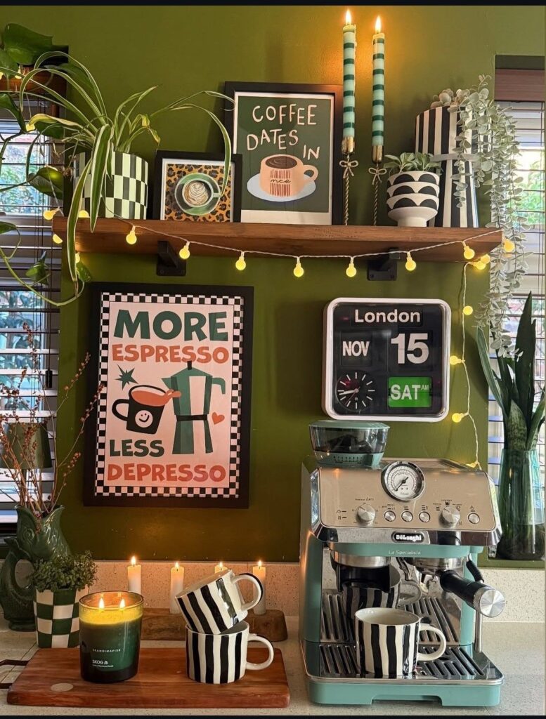 Obsessed with this deep green wall and fun coffee-themed art—it’s the perfect mix of cozy and cheeky! Layer in string lights, quirky signs like “Coffee Dates in Depresso,” and fresh greenery to make your coffee station feel like the happiest corner of your home.