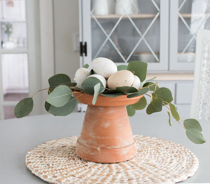 Bring some earthy Easter charm into the home with a cute but affordable DIY Easter Centrepiece. An upside down pot and eggs displayed on some simple greenery creates a charming piece for the centre of the table.