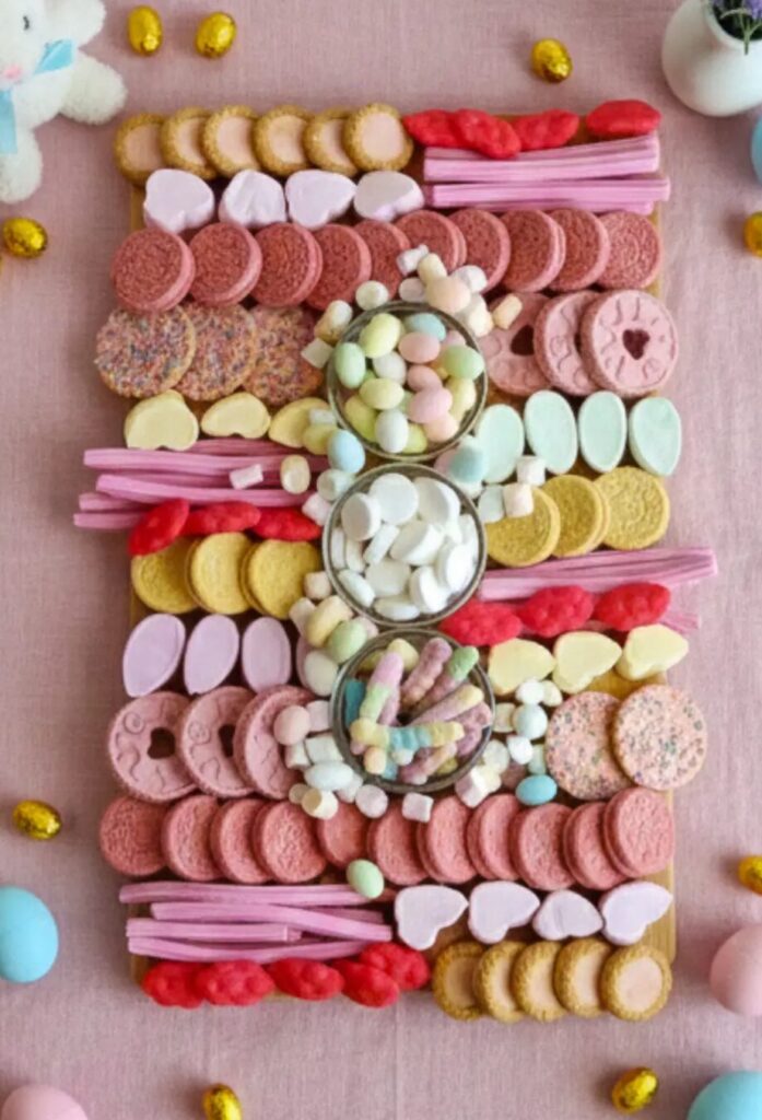 This Easter dessert board is a vibrant, “maximalist” display that leans into a pastel spring palette. It’s essentially a candy and biscuit charcuterie board that swaps out savory meats for sweet treats.