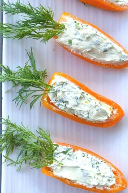 These orange peppers sliced halfway make great edible dip containers that also look like carrots. For the full recipe, visit Wide Clock.