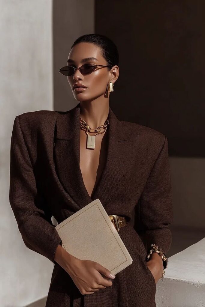 To truly level up, remember to lean into the “more is more” philosophy. Don’t be shy with your accessories; the contrast between sculpted, padded shoulders and a heavily cinched waist is what gives this look its power. Finish the ensemble with chunky jewelry—like gold cuffs worn right over your sleeves—to coordinate with your belt hardware.