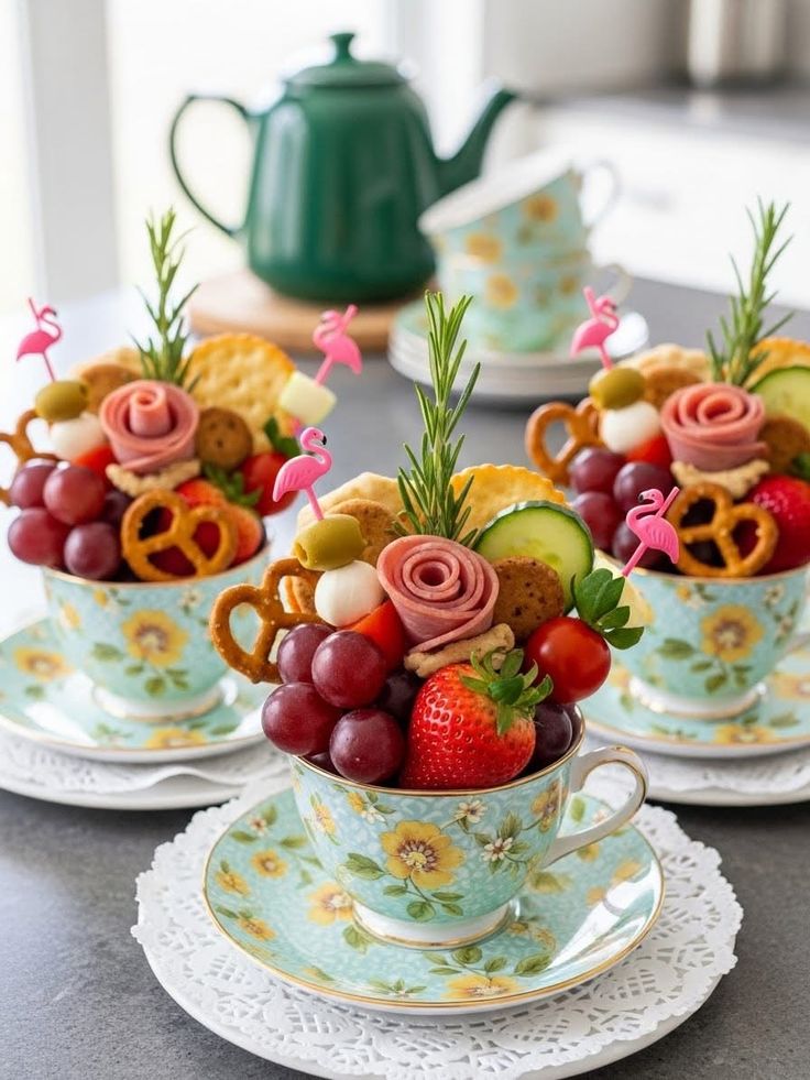 The traditional grazing board gets a whimsical, tea-party-appropriate makeover by moving the elements into vintage teacups. This isn’t just about portion control; it’s about making the food part of the table’s decor.