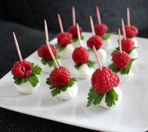 - The Assembly: Skewer a single fresh raspberry, a small leaf of flat-leaf parsley, and a mini mozzarella pearl (bocconcini).