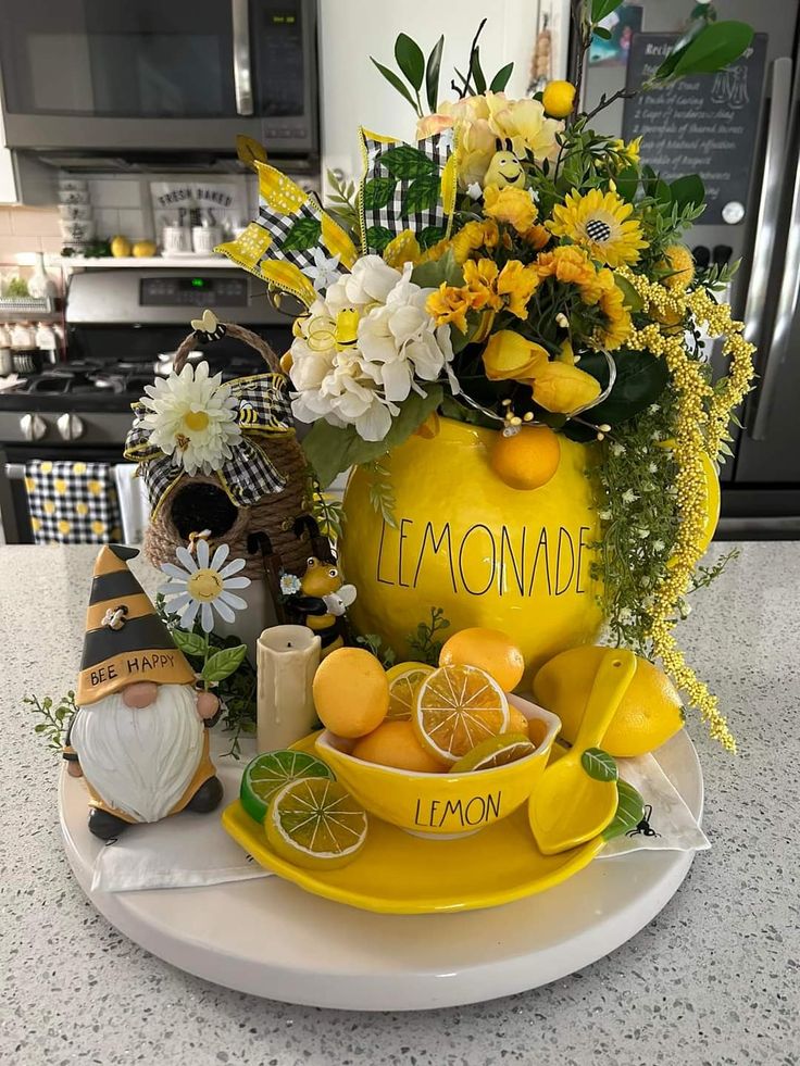Combining citrus with honeybee accents is a match made in decor heaven!This cheerful setup uses a “Bee Happy” gnome and Rae Dunn-inspired pottery to create a playful, themed centerpiece that’s buzzing with personality.