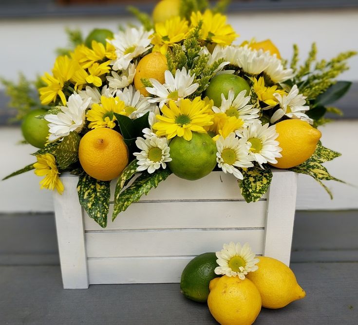 A crisp white planter box is the perfect high-contrast backdrop for vibrant yellow citrus. It’s a clean, modern look that makes your lemon decor really “zing” against a neutral mantel or windowsill.