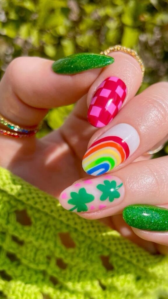 I love how this St. Patrick’s Day manicure mixes vibrant green glitter with playful rainbow and shamrock accents for a truly festive look.