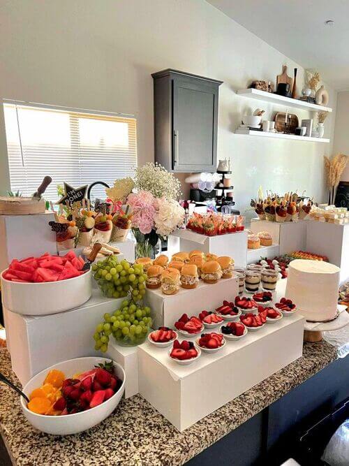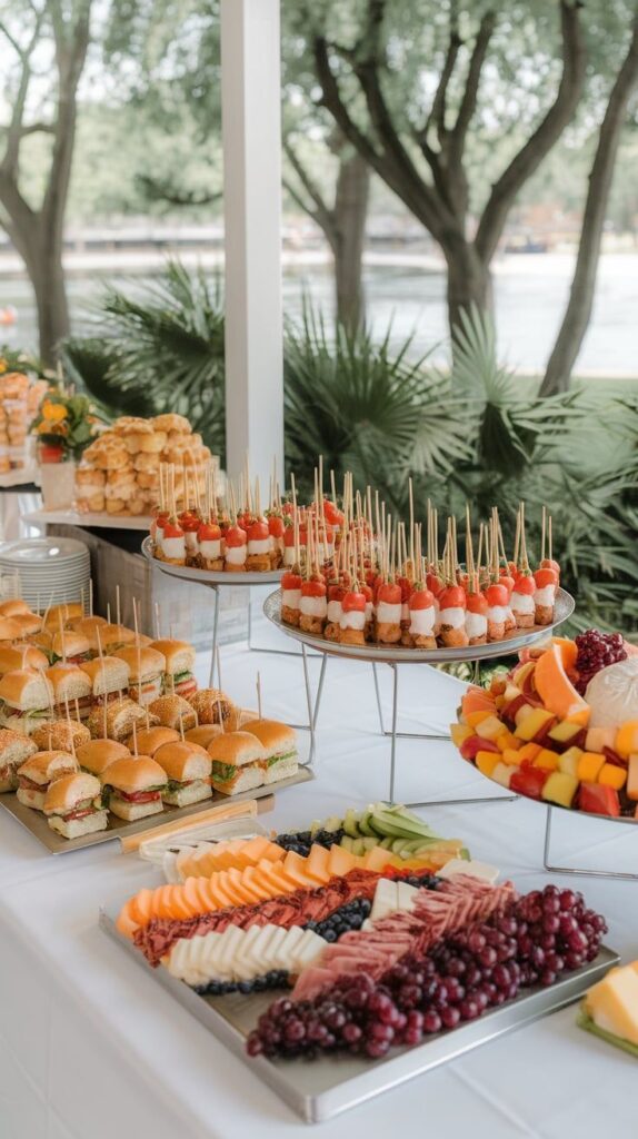 - Savory & Fresh Balance: Small sliders on brioche buns are stacked for easy access, alongside individual bowls of mixed berries and larger platters of sliced watermelon and grapes.