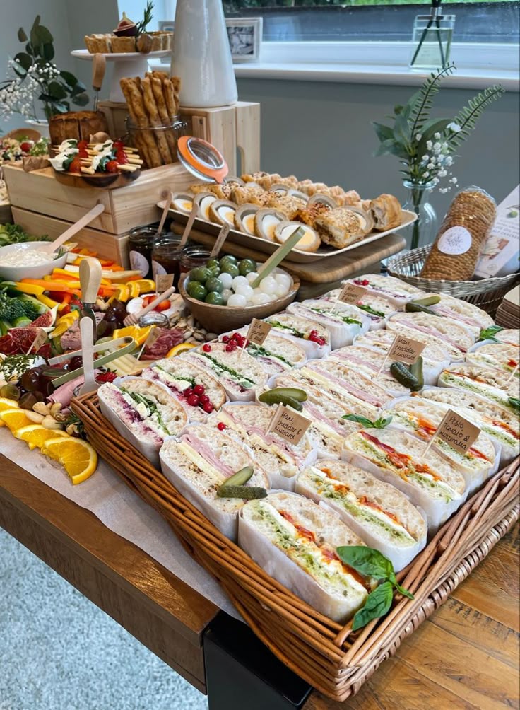 - The Sandwich Selection: Thick-cut artisan bread sandwiches, neatly wrapped in parchment paper and labeled with small flags identifying fillings like “Pesto, Tomato & Mozzarella” and “Ham, Cheddar & Mustard”.