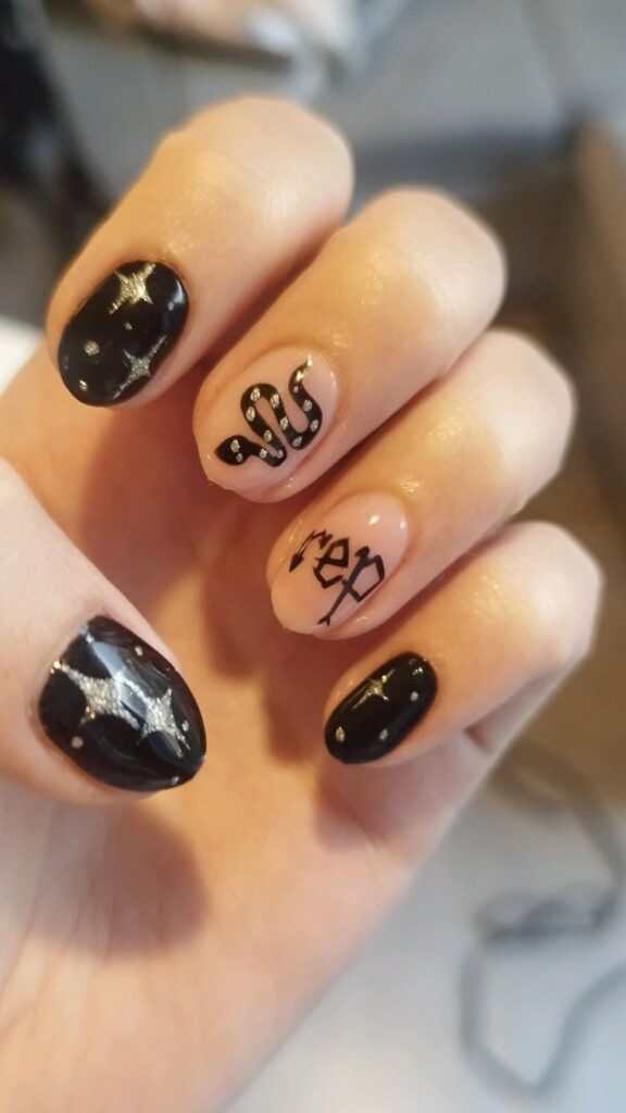 Channel your inner “Look What You Made Me Do” with a sleek, dark design inspired by the Reputation era. Using matte blacks combined with glossy snake-skin textures or silver accents creates a high-fashion edge that is impossible to ignore. It’s a bit gothic, a bit glam, and 100% iconic.