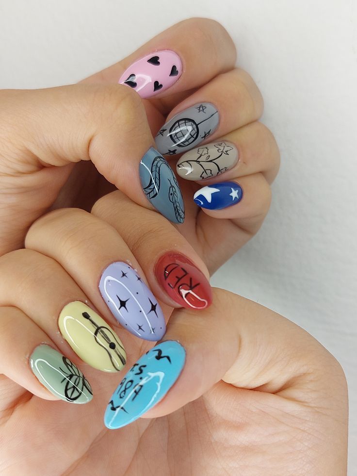 This manicure is the ultimate “Eras” set, where each nail represents one of Taylor Swift’s albums through specific colors and iconic symbols.