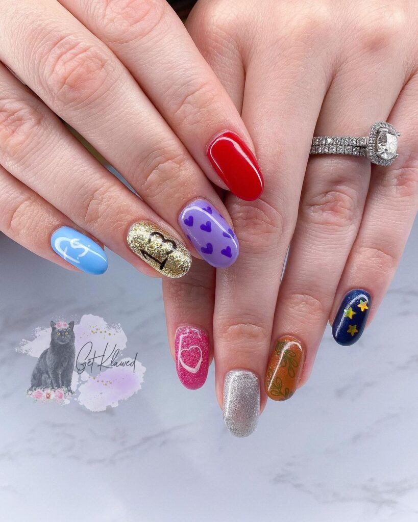 Why choose one era when you can have them all? This look is a total fan favorite because it captures the vibrant energy of the entire discography. Each nail represents a different chapter—think shimmering teal for the Debut, gold for Fearless, and deep red for, well, Red. It’s bold, it’s sparkly, and it’s basically a friendship bracelet for your fingertips.