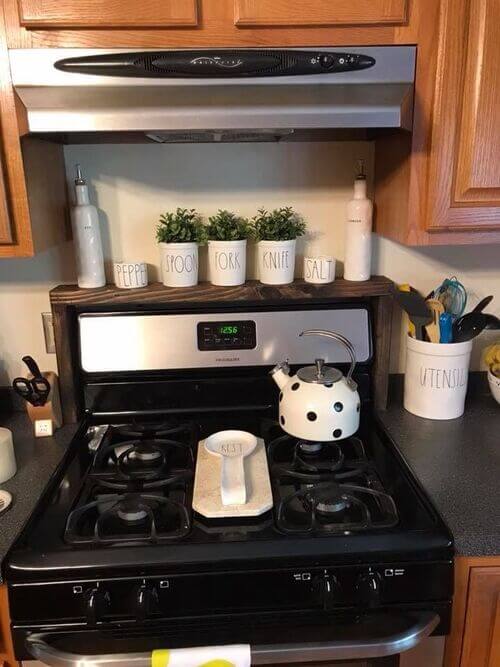 Adding a wood hutch or shelf above your stove is both charming and functional. It creates storage where you might not have had any and gives you a place to display decorative yet useful items.