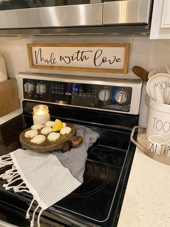 A vintage or handcrafted sign can instantly make the kitchen feel more welcoming. Phrases like “Made with Love” or “Gather Here” work well and add a cozy, lived-in feel.