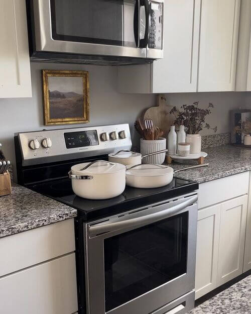 Artwork isn’t just for living rooms. A framed print or kitchen-themed sign above the stove adds personality and makes the space feel intentional.