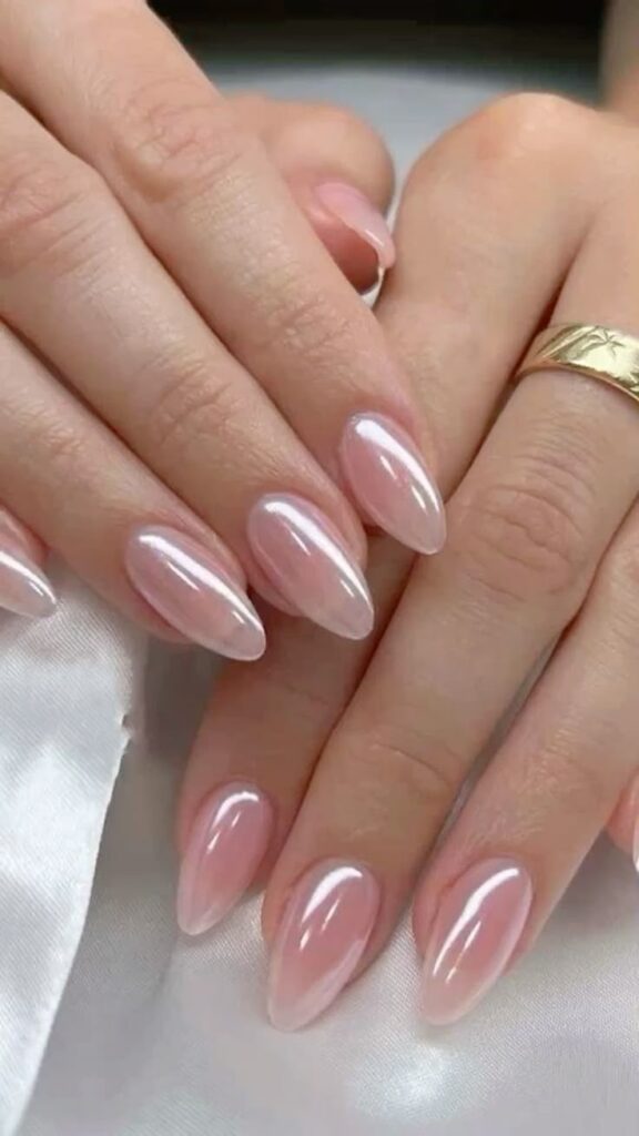 - The “Clean Girl” Aesthetic: Most wedding styles lean toward a polished, healthy look. Soft milky whites, sheer pinks, and “glazed donut” finishes create a blurred, sophisticated effect that makes the hands look elongated and bright.